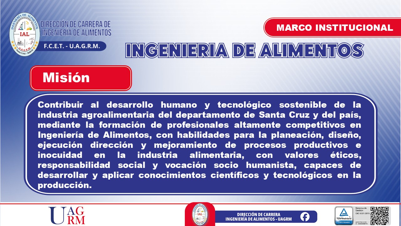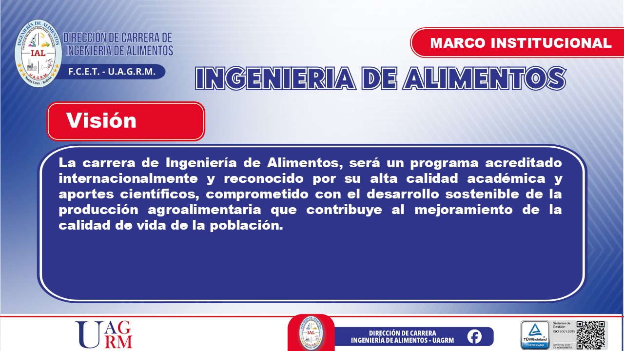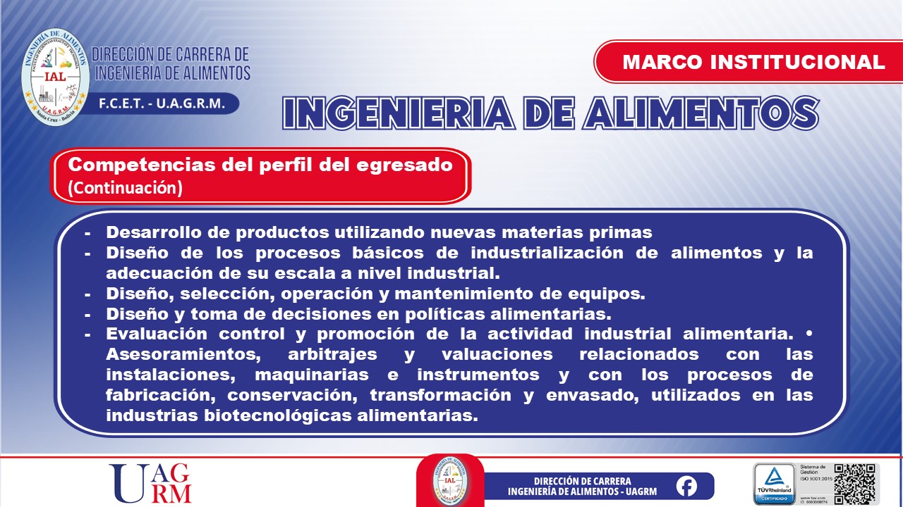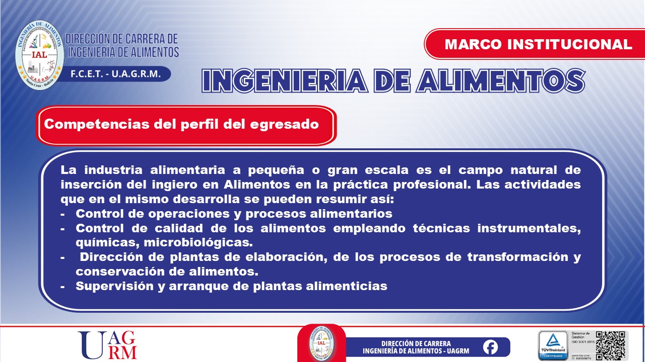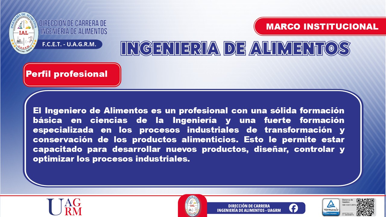 El egresado de la carrera de Ingeniería de Alimentos será un profesional con una formación científica, tecnológica y ética que le permitirá desarrollar, optimizar y gestionar procesos de producción, conservación y comercialización de alimentos. Contará con una visión innovadora y