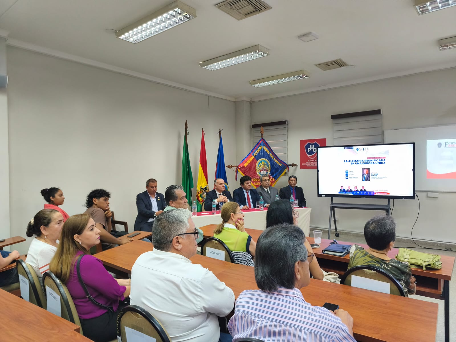 Como parte de la agenda, el embajador brindó la conferencia magistral “La Alemania reunificada en una Europa unida” en la Facultad de Ciencias Jurídicas con la participación de autoridades diplomáticas y universitarias, además de docentes y estudiantes. Durante el acto, se destacó la importancia de estos encuentros académicos como espacios de transmisión de conocimiento que aportan al fortalecimiento de vínculos internacionales y a la apertura de nuevas oportunidades para la comunidad universitaria.